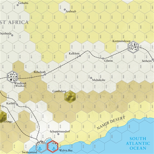 Windhoek: The Campaign in German Southwest Africa, 1914-15 is a wargame of the campaign in which British Empire forces, mainly from the Union of South Africa, conquered the German colony of Southwest Africa. In the original campaign, the British won within ten months, but the campaign could have gone different, as von Lettow Vorbeck demonstrated in German East Africa. This is a two-player game, in which one side commands the Germans, and the other Allied forces (including South Africa, British and Portuguese colonial). The Allied player must win the game quickly, while the Germans win by delaying the Allies beyond the historical time frame. The central game mechanism is Action Points (AP). These are a quantification of each sides command and logistical capabilities. Players expend AP to recruit units and conduct various military operations. On the map each hex represents approximately 25 miles.