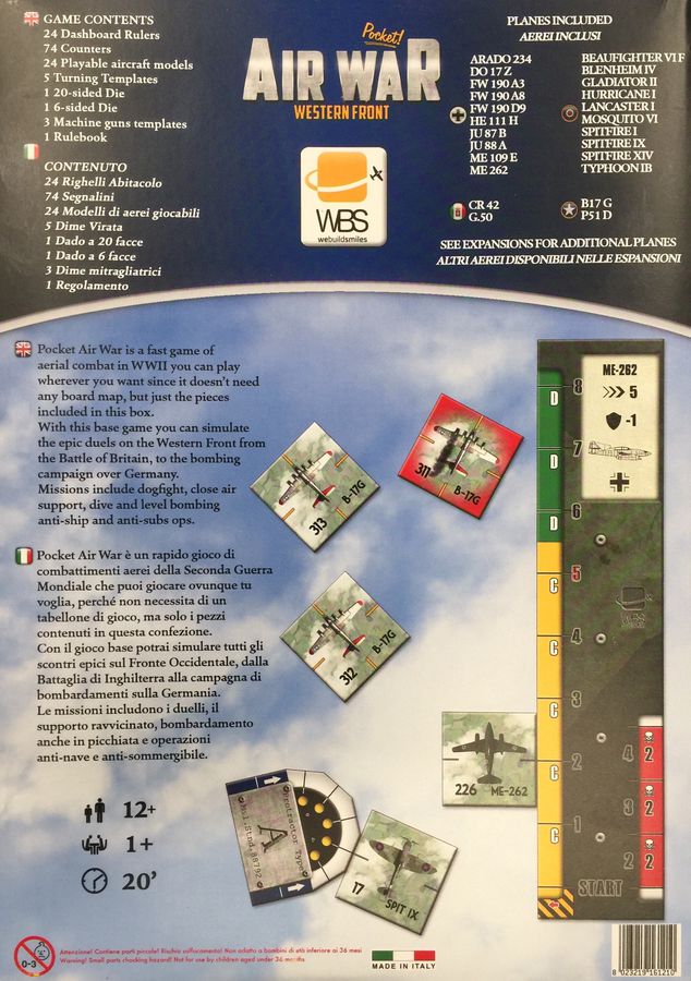 Pocket Air War is a fast game of aerial combat in WWII you can play wherever you want since it doesn’t need any board map, but just the pieces included in this box. With this game you can simulate the epic duels on the Western Front from the Battle of Britain, to the bombing campaign over Germany. Missions include dogfight, close air support, dive and level bombing anti-ship and anti-subs ops.