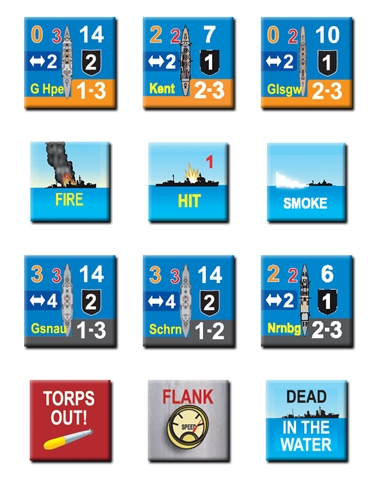 Each counter depicts a single ship or the information markers required to denote a ship’s damage, special ship movement, or configuration. Ships are rated for weight of fire, range, structural integrity, maneuver, speed, and special capabilities.
