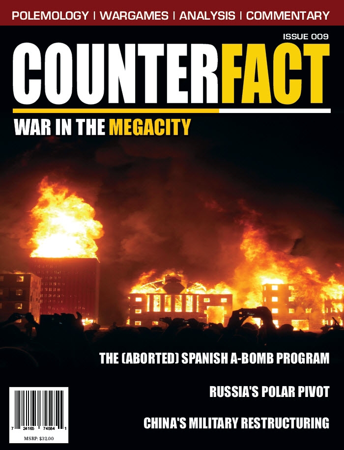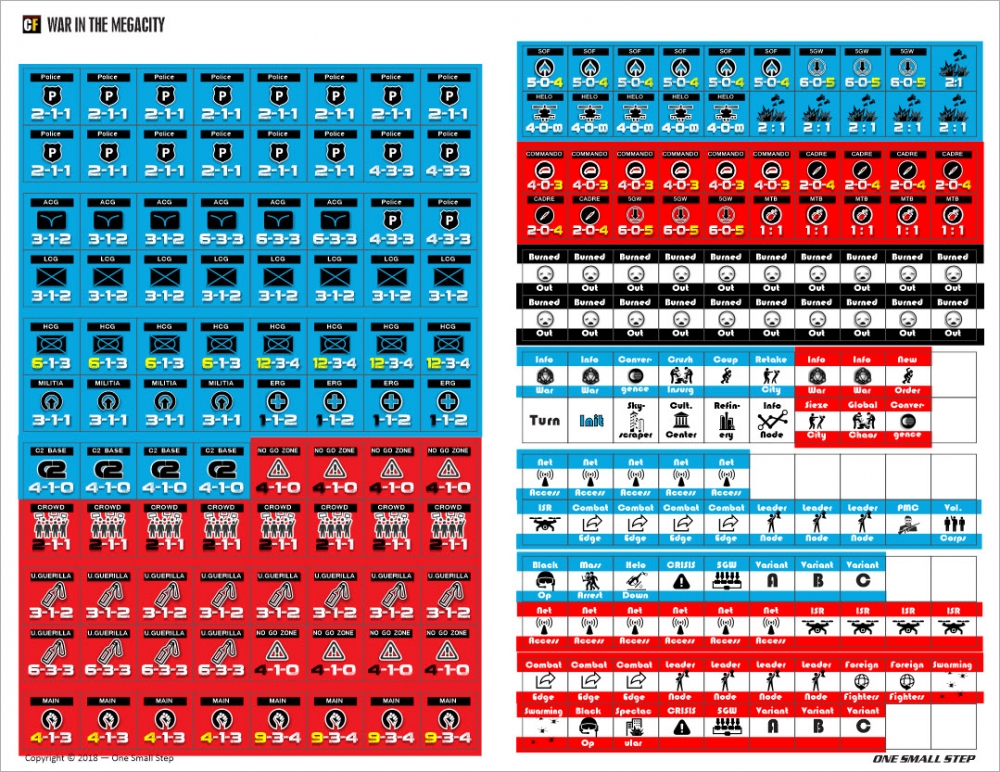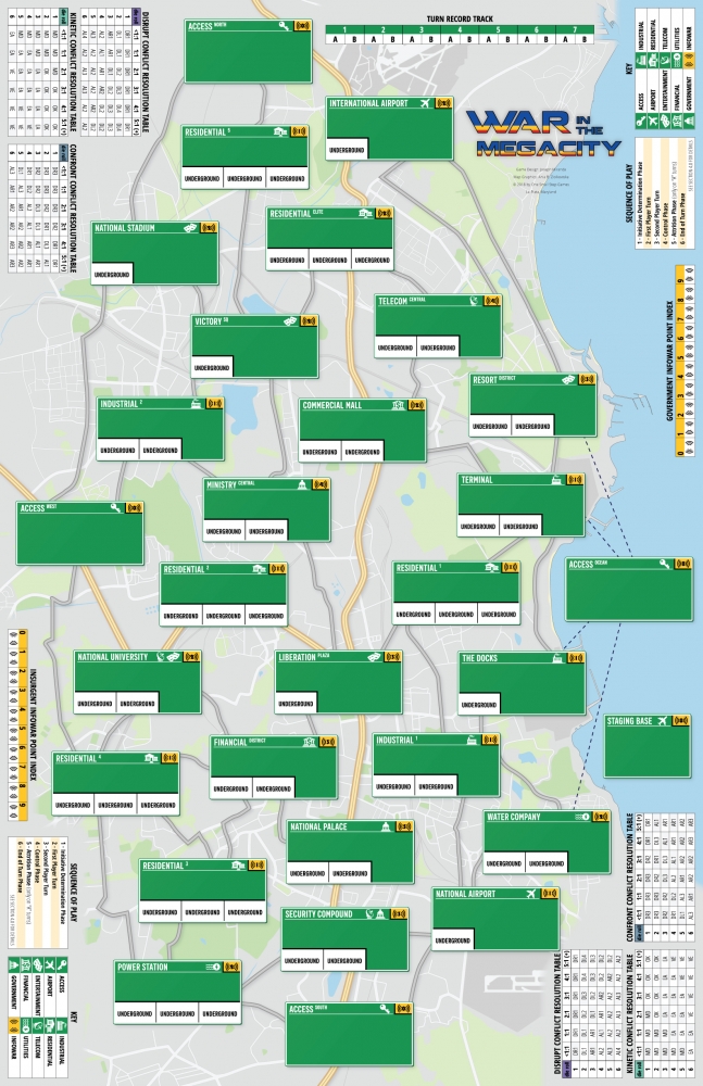 War in the MegaCity is a simulation of a fight for a city in the near future. It covers conventional, unconventional and civil disturbance operations. One player controls Government forces, the other the Insurgents.Designed by Joseph Miranda