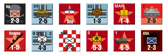 Red Victory includes full-color player aids like those for the Defiant Russia Players’ Edition, including scenario set-ups. The 180 pieces represent for the most part armies for the Soviets and corps for the Germans. There are also Yugoslav partisans, Romanians, Bulgarians, and Hungarians present. There’s also a 32-page book containing the rules and the usual background you’ve come to expect from an Avalanche Press product.