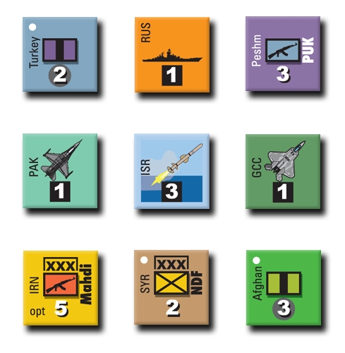 The game system models the situation at the highest strategic level. Using a variation of Ty Bomba's Putin's War (MW #29). Each hex on the map represents 62 miles (100 km) and each turn of play represents anything from three days of intense combat to a couple weeks of refitting. Ground units represent mostly corps sized formations, with some divisional task forces. Special forces units are regiments, brigades or groupings of cadres. The combat aircraft units represent various numbers of sorties needed to accomplish missions over the time frame of a turn. The game system models operations in a vast theater with limited infrastructure and coalition forces which have divergent political aims with the objective of each player being to seize critical resource, logistics and communications centers, thereby gaining control of the Middle East.