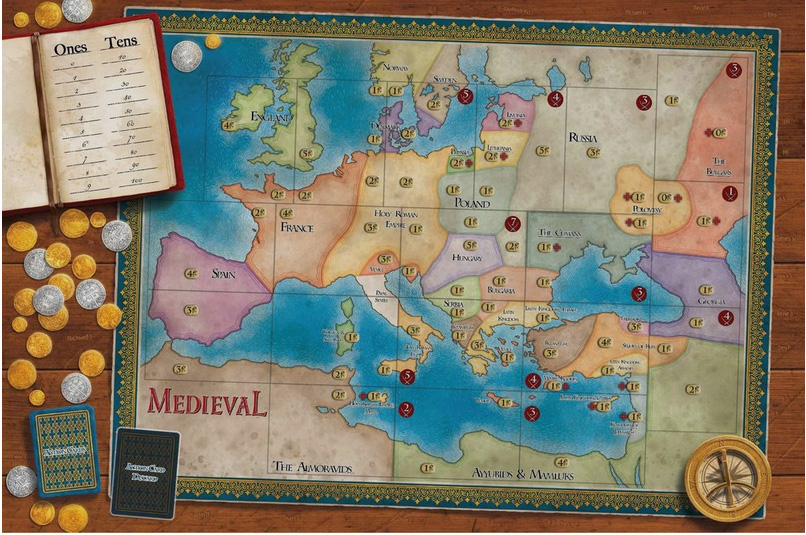This second edition of Medieval features a full-on graphic and component overhaul of the original, mounted map (in lieu of cards), streamlined rules, and new optional rules for games with one, two, and six players.