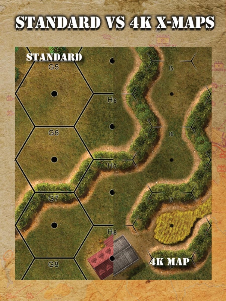 4K X-Maps are actually two products in one. X-Maps bring the Lock ‘n Load Tactical series games to a grander scale, with a substantially larger playing surface and hexes that are nearly double those of the standard maps. In comparison, X-Maps are 11” x 17” as opposed to the 8.25” x 12.75” standard maps.