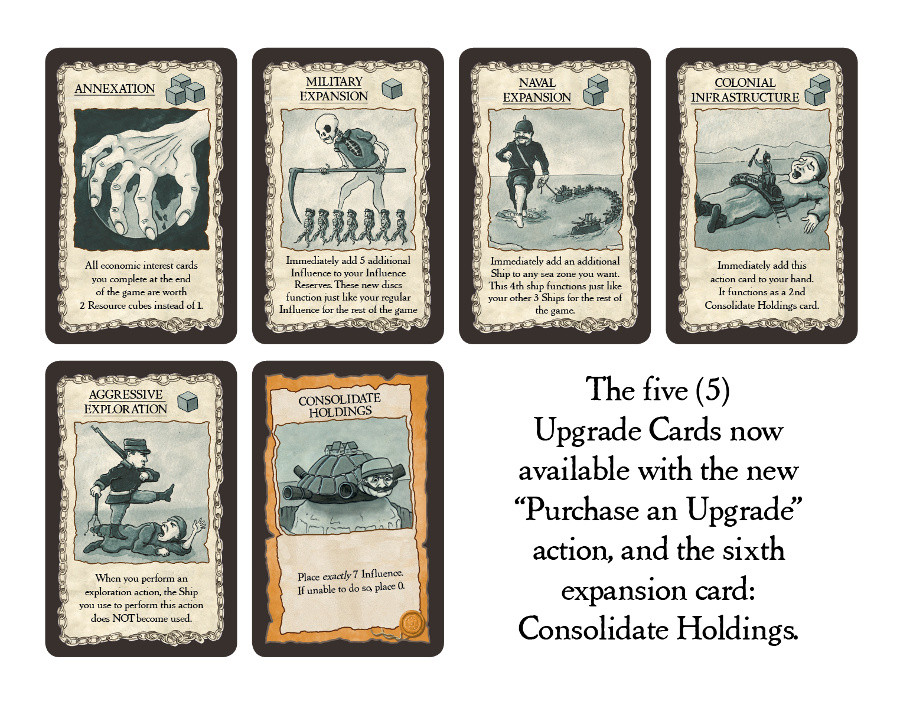 So what is new in this edition? The main items in this new edition are the 6 new cards, five of them being Upgrade cards. This edition therefore adds a new action to the game: Purchase an Upgrade card.