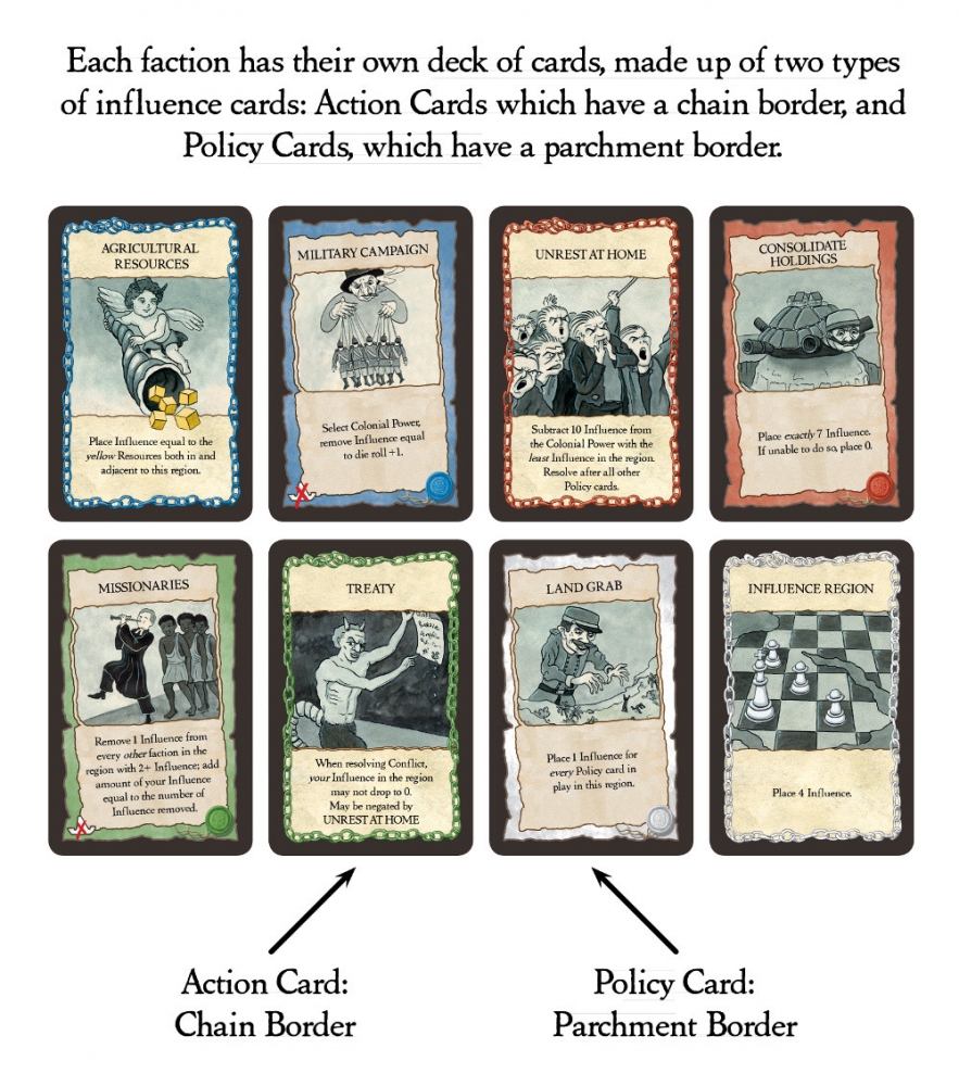 In the game, each player has their own deck of 24 influence cards. The decks of all players are identical. 7 of the 24 cards are action cards that are played and immediately resolved. The other 17 cards are policy cards that are played face down to one of the six regions of the game board. All policy cards are only resolved in the colonialism phase of a game turn. These cards increase or decrease a player's influence. This innovative mechanic is exciting, suspenseful and reduces downtime.