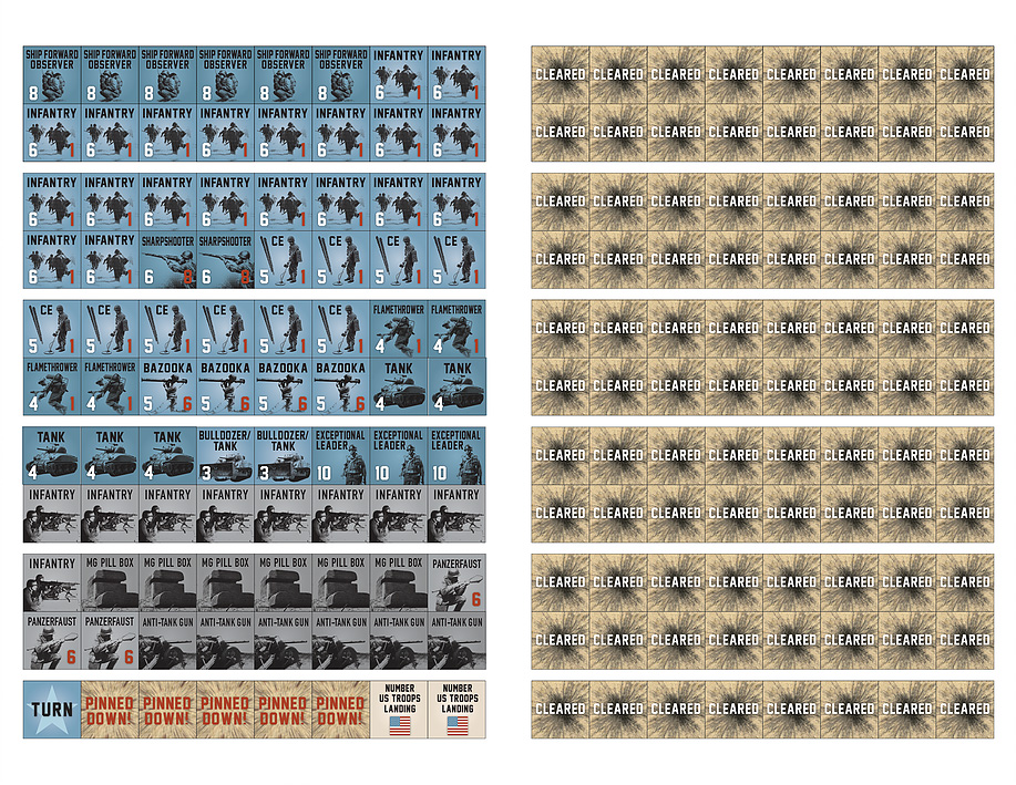 The Player’s assault force faces German defensive fire (solitaire, system-controlled) from machine guns and anti-tank emplacements, panzerfaust and rifle fire, as well as off-map German artillery. When the bluffs are reached, American units must clear the trenches by assault.