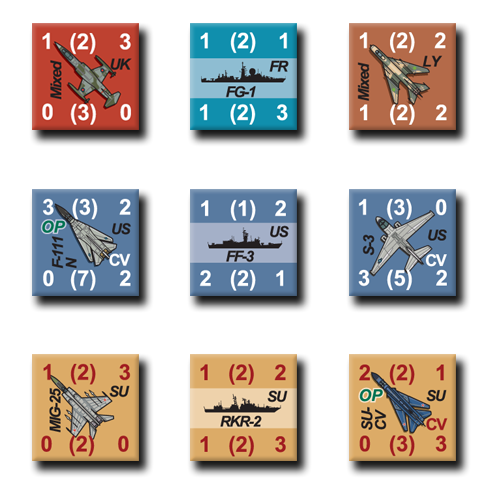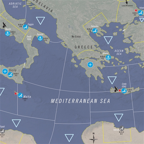 Aircraft units represent one to six squadrons, with the counter displaying the primary type of aircraft. Ship units represent one fleet aircraft carrier or battleship and “divisions” of four cruisers or nuclear-powered submarines with destroyers being represented in squadrons of six to eight destroyers or non-nuclear subs. Other ship types are represented at the division level and represent various numbers of ship types. On the map, each inch equals 20 miles. Each turn represents from one day to one week of activity, depending on the level of activity. Sixth Fleet is based on Red Dragon Rising. Changes have been made based on the situation in the Mediterranean during the Cold War.
