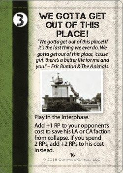 This edition involves the use of three card decks, A red deck (communist), a blue deck (Allied) and a black deck (interchangeable). Prior to every game, half of the black deck is shuffled into each of the red and blue decks ensuring a different game every time. Cards indicate the amount of RPs (Resource Points) that may be spent or banked, a historic situation, and its game effects. Certain cards are year specific. Within each Red and Blue Deck are a number of Campaign cards that may be chosen by each player allowing increased abilities but only in a predetermined area.