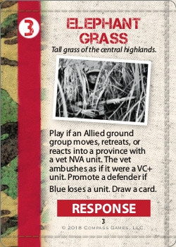 This is a card-driven, area-based design with low counter density and a much simplified combat system. Each scenario represents a year and players have the flexibility of starting in any year of the war and ending in any later year of the war. Players choose either the Allies (US, ARVN, Cambodian and Laotian) or Communist (NVA, VC, Cambodian and Laotian) Players engage in guerrilla warfare – VC units remain hidden until engaged. VC units may be simple units or reinforced units or simply false information. When determined to be false information, players roll on the Bush Events Table which involve events from discovering Chinese troops to the arrival of USO shows featuring John Wayne and Bob Hope.