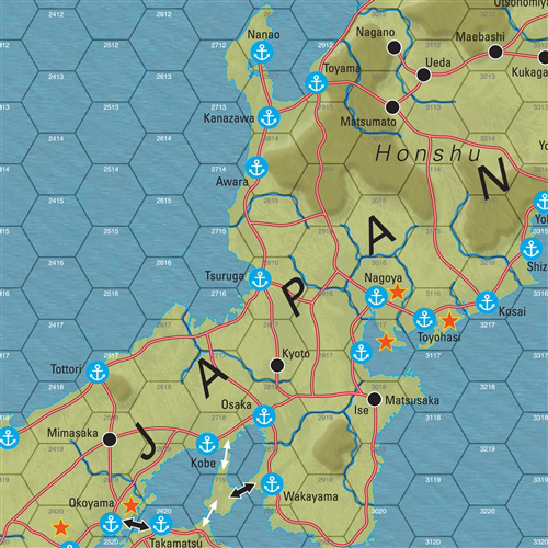 The Dragon that Engulfed the Sun is a two-player operational-strategic-level wargame simulating a hypothetical Chinese invasion of Japan. The premise of this game is a sudden war has erupted on the Korean peninsula, compelling China to intervene in the conflict—this time well before the United States could reinforce South Korea sufficiently to prevent it from being overrun. The Chinese realize there may never be another opportunity to completely extirpate the US from the Asian mainland, they have irrevocably committed themselves to this path, and thus it is their resolute intention to finally settle old scores with the Empire of the Sun. The map covers the militarily significant terrain of Japan and surrounding areas. Each hex on the map equals ~36 miles (58 kilometers) from side to side. Each game turn represents about a week. Playing pieces represent divisions and brigades, as well as occasional regiments and even battalions.
