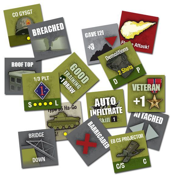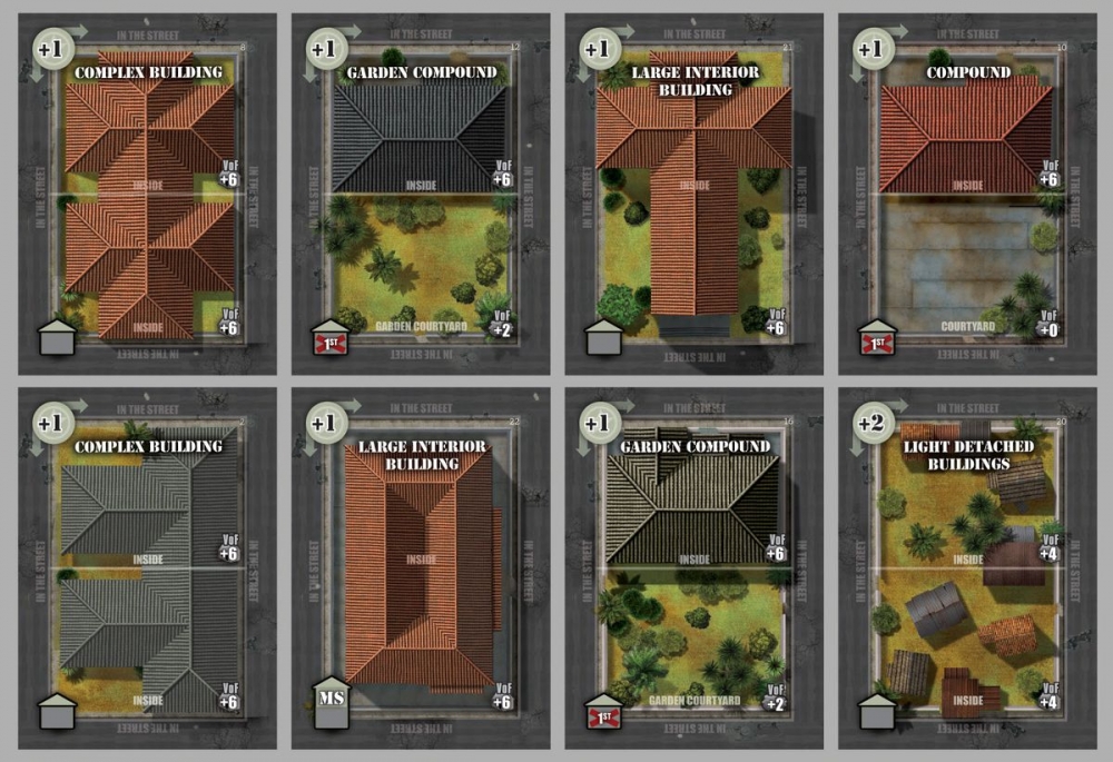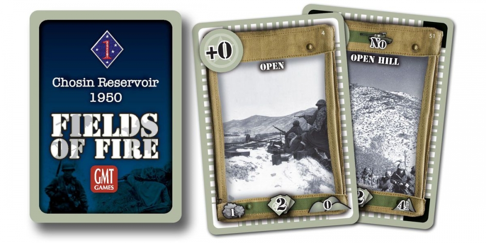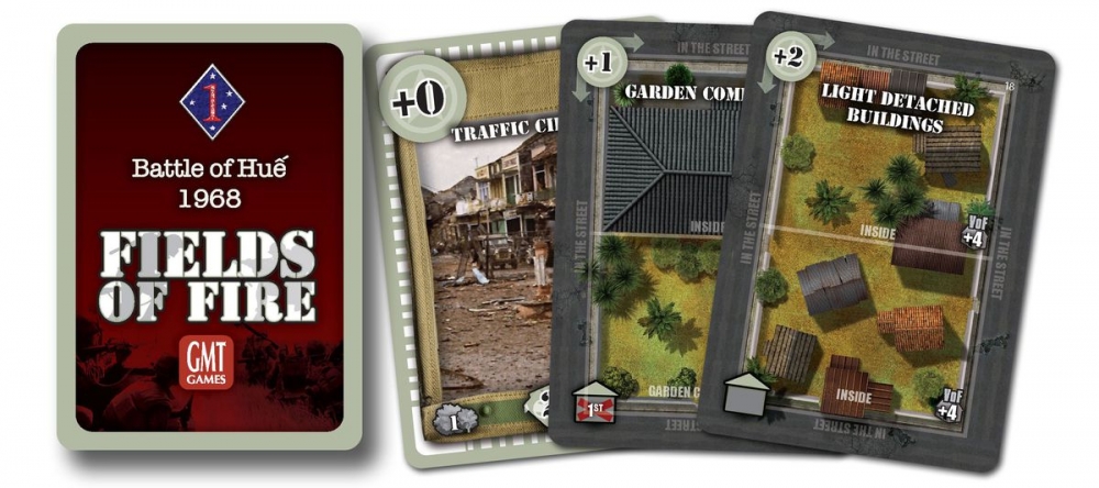 Fields of Fire is a solitaire game system that gives players the challenge of commanding a rifle company between World War II and Present Day. The game is different from many tactical games in that it is diceless and card based. There are two decks used to play. The Terrain Deck is based on a specific region and is used to build a map for the various missions your company must perform. The Action deck serves many purposes in controlling combat, command and control, various activity attempts. The units of the company are counters representing headquarters elements, squads, weapons teams, forward observers, individual vehicles or helicopters. A single playing is a mission and several missions from an historical campaign are strung together for the player to manage experience and replacements. A mission can be played in about 1 – 2 hours.