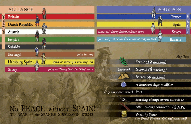 In November 1700, King Carlos II of Spain died without an heir. The long-standing feud between the Bourbons and Habsburgs erupted once again as both sides pressed their claim to the throne. No Peace Without Spain is a two-player game that elegantly recreates this epic struggle using a point-to-point map and a single deck of 55 cards. Action cards are used to activate armies for movement and siege, while event cards bring historical and special events into play that can swing the tide of fortune when least expected. Each turn represents one year, each “corps” represents 10,000 men of all arms and each leader represents a major commander and his staff.