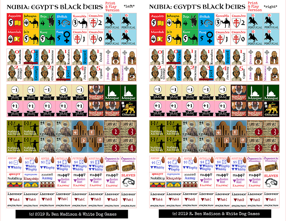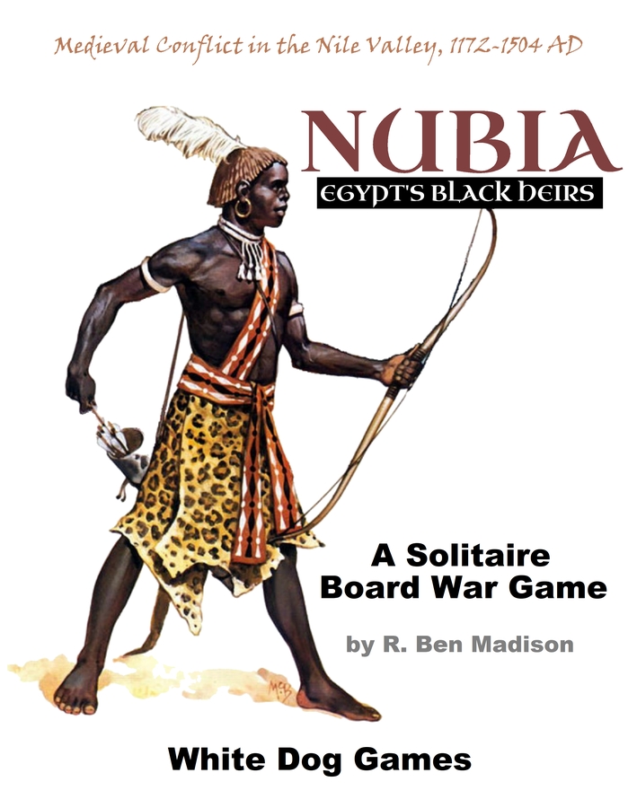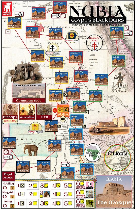 NUBIA is a solitaire strategy game based on that conflict, designed by R. Ben Madison and published by White Dog Games. In the game, you play the Samet (samet) or Prime Minister of medieval Nubia, advising the Uru (ourou, King) on how best to save your Black, literate, Christian civilization from pagan plunder and Muslim defilement.
