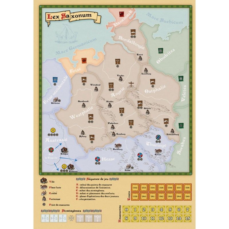 Lex Saxonum est un jeu pour deux joueurs qui simule la conquête de la Saxe par Charlemagne dans le dernier quart du VIIIe siècle. L’un des joueurs représente les Carolingiens d’Austrasie, de la Hesse, de Thuringe et de Frise occidentale, l’autre joueur contrôle les différentes fédérations tribales saxonnes et leurs alliés danois et frisons. Le but de Charlemagne est d’intégrer la Saxe au domaine carolingien, y compris par la terreur et des massacres exemplaires.