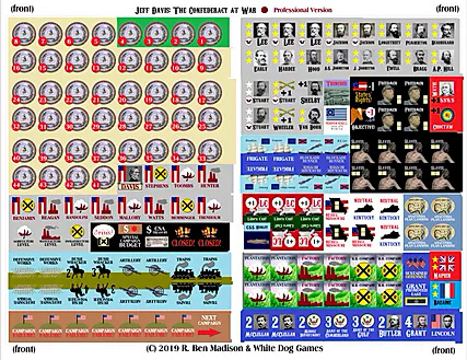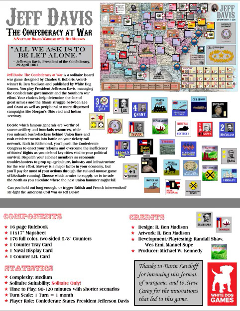 Jeff Davis: The Confederacy at War is a solitaire board war game designed by Charles S. Roberts Award-winner R. Ben Madison. You play President Jefferson Davis, managing the Confederate government and the Southern war effort. Your choices help determine the fate of great armies and the titanic struggle between Lee and Grant as well as peripheral or more dispersed campaigns like Morgan’s Ohio raid and Indian Territory. Decide which famous generals are worthy of scarce artillery and ironclads resources, while you unleash bushwhackers behind Union lines and rush reinforcements into battle on your rickety rail network. Back in Richmond, you’ll push the Confederate Congress to enact your reforms and overcome the inefficiency of States’ Rights as you defend key cities vital to your political survival. Dispatch your cabinet members as economic troubleshooters to prop up agriculture, industry and infrastructure for the war effort. Slavery is a major factor in your economy, but you will pay for most of your actions through the cat-and-mouse game of blockade running. Choose which armies to supply or if to invade the North as you calculate where the next Union hammer might fall. Can you hold out long enough to trigger British and French intervention? Re-fight the Civil War as Jeff Davis!