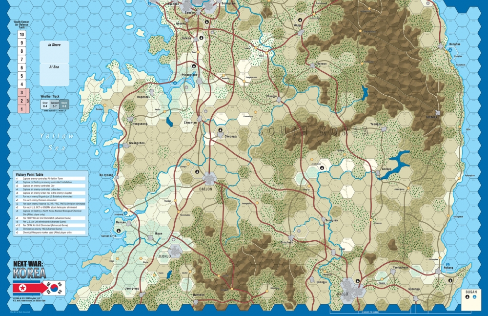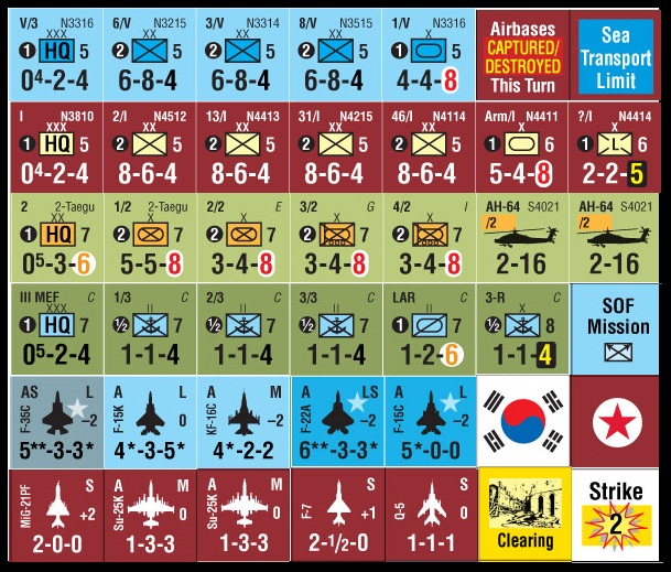 This reprint edition will include all known errata (including counters) as well as updated counters for the US (as printed in Next War: Taiwan), Chinese, Russian, and Japanese Orders of Battle. The map will change slightly as we bring both the bridging rules from Next War: India-Pakistan back to this game, which necessitates noting which hex sides can't be bridged, as well as defining Beaches and Invasion Hexes a la Next War: Taiwan, which actually takes us back to the original Crisis: Korea 1995 map. The Series Rules and Player Aid Cards will be brought up to the latest standards, and, of course, the Game Specific Rules will have to be changed to incorporate all of the above.