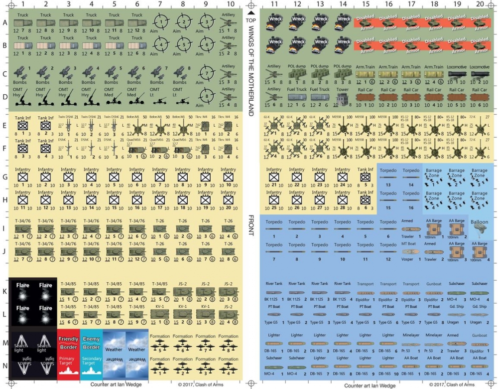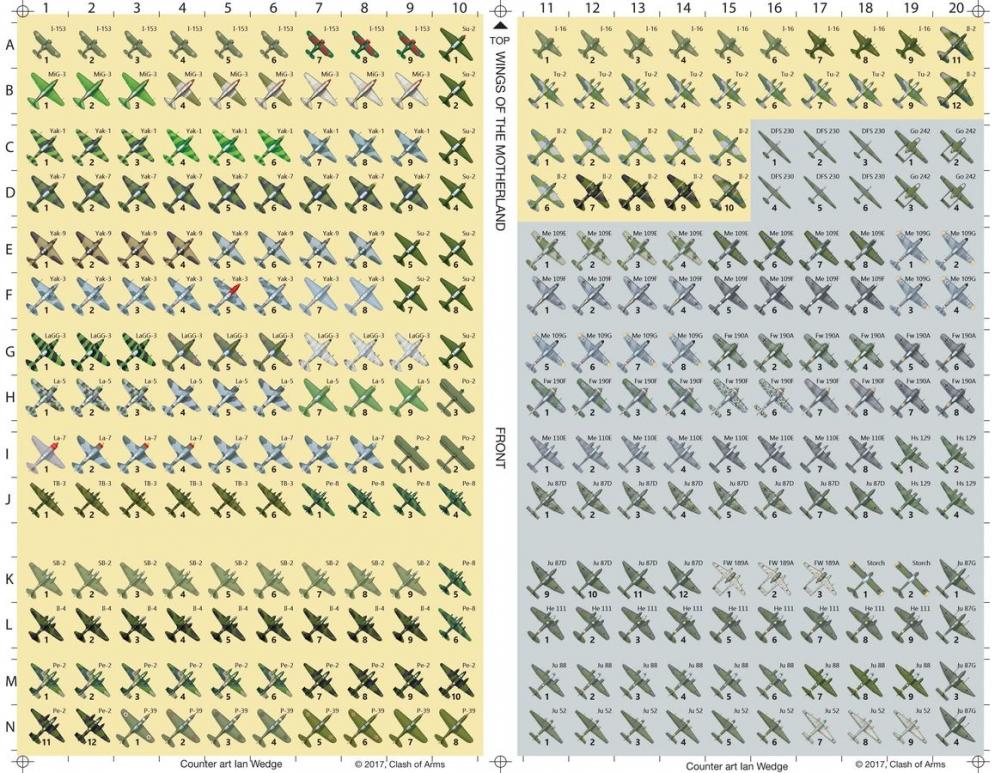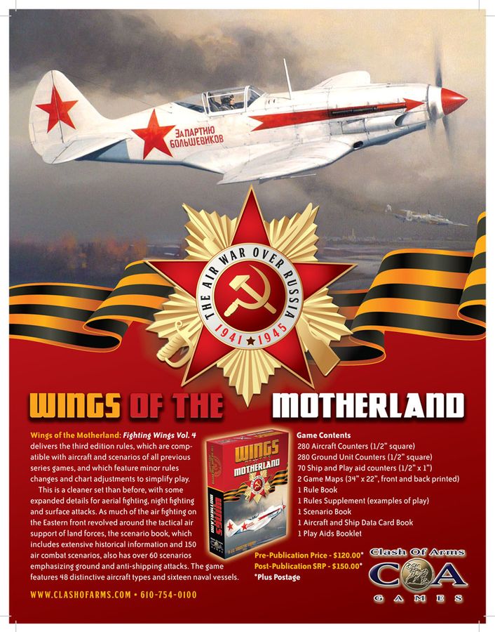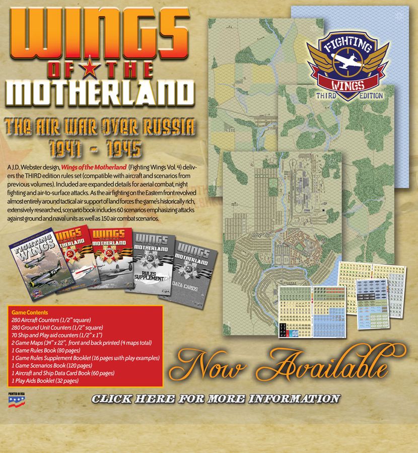Fighting Wings game system (Volume 4) goes to the Russian front, modeling aircraft and situations from the German invasion of Russia in the Summer of 1941 to the fall of Berlin in 1945. 48 new aircraft ADCs (very few duplicates from previous games and if so these are updated with better information), two double sided maps for four unique playing surfaces and two full counter sheets of air and ground units, one half counter sheet of ships and play-aid counters, plus the third edition rules and playa aids for the Fighting Wings system.