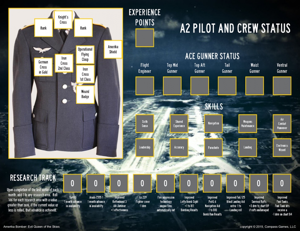 Amerika Bomber: Evil Queen of the Skies is a solitaire, tactical level game which places you in command of a hypothetical, yet historically-based bomber aircraft during a frightening look at what might have been in World War II. Each turn consists of one sortie, during which the player will fly a mission to bomb the mainland of the United States. As the player progresses, he may choose to upgrade to even more advanced bombers in this alternate history game. Amerika Bomber is based on the popular, action-packed “B17: Queen of the Skies” system and pays homage to Glen Frank’s original system, but with streamlined routines and a few twists. It builds a strong narrative around the pilot as you look to earn skills, rise in rank through promotion, receive awards and survive a dangerous year above America.
