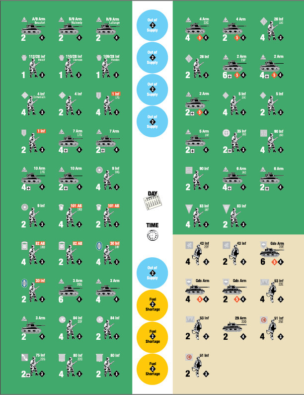 The simple elegance and high player-interaction of the WWII Commander games recreates the tension of key battles of the Second World War. The overall game system is easy to learn and makes a great introduction to war games, but mastering its tactics and strategy is a true challenge as the players take turns deciding which units to activate on either attack or defense. As the German player, you must make big gains and be as aggressive as possible while you hold the numerical advantage without over-committing your units, over-extending supply lines or falling prone to fuel shortages. As the Allied player, you must first withstand the initial German surprise attack and coordinate effective holding actions while defending key geographic objectives as you muster your arriving forces for counterattacks.