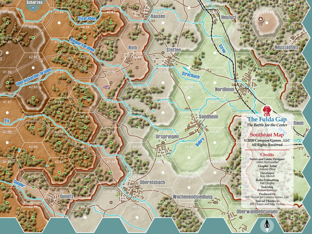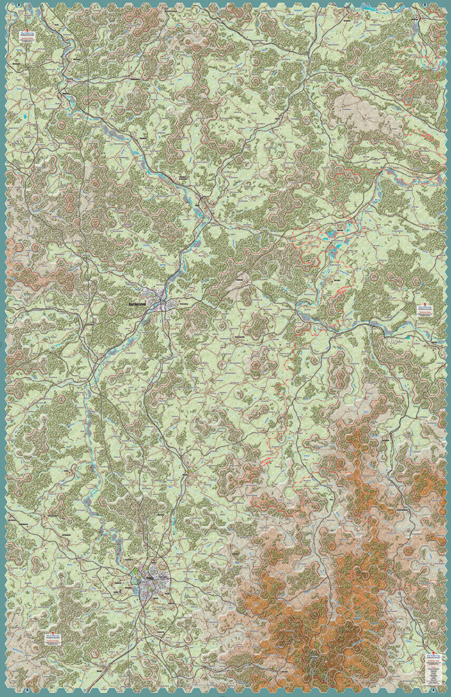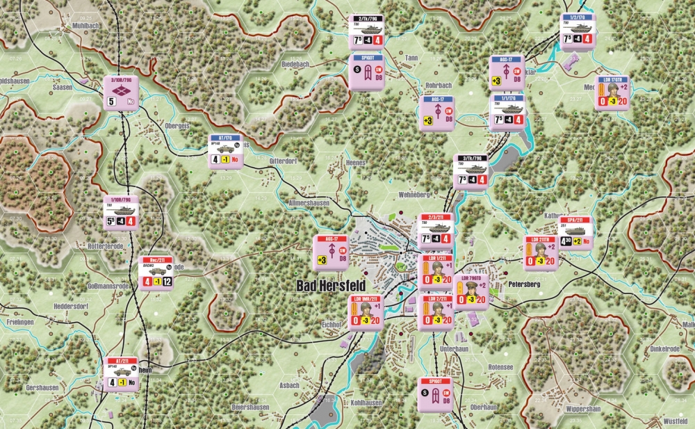 Wetzel's Backhand Blow. This is the other campaign game. This assumes that NATO lets the Soviets come head long forward through the map area and are held to the southwest at Frankfurt. Over the next four days, the NATO line stiffens and on Day 4 of the war, the V Corps counterattacks with everything they have deep into the Soviet rear. Another 4 mapper covering 4 days. The Soviets will slowly retreat but all will depend on NATO taking the vital ground in the area and surrounding the Soviet spearhead to win the war.