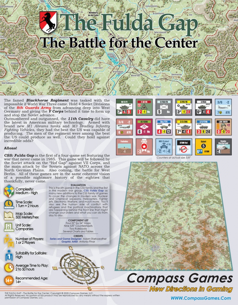 This is the first game in the Central Front series of games using the Company Scale System (CSS) system. It will feature nuclear weapons, chemical weapons, helicopter support, air support, electronic warfare, and many other aspects of modern warfare. Future games in the series will include the Hof Gap defense, the German Northern Plains defense and the last stand at Berlin.
