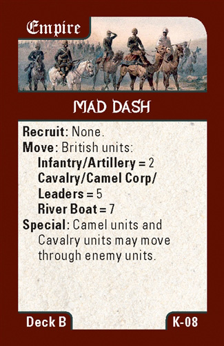 This is a two player game using of Hand of Destiny series rules. One player commands the Mahdist forces, ranging from tribal levies to well-armed regulars, with the objective of taking Khartoum. The other player controls the Anglo-Egyptian forces consisting of British regulars, Egyptian army units, and mercenaries with the goal of relieving the forces under Gordon who are trying to hold Khartoum.