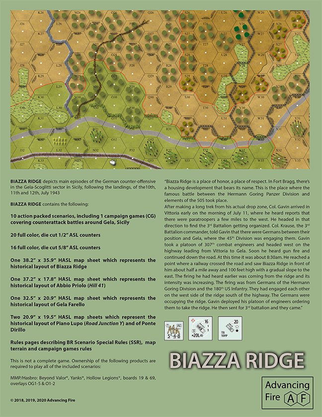 Ownership of the following Hasbro/MMP ASL products are required to play all of the included scenarios: Beyond Valor®, Yanks®, Hollow Legions®, boards 19 and 69, overlays OG1-5 and O1-2