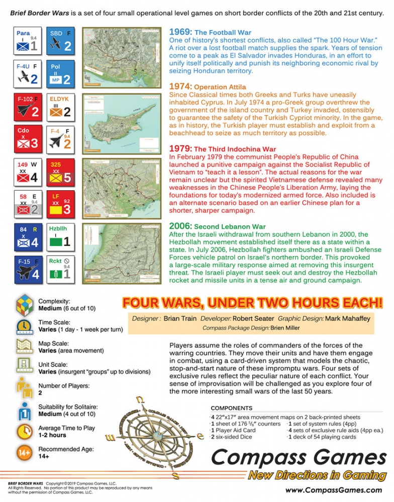 Brief Border Wars is a quadrigame or set of four mini-games on short border conflicts of the 20th and 21st century, using a card-driven system that models the chaotic, stop-and-start nature of these impromptu wars.