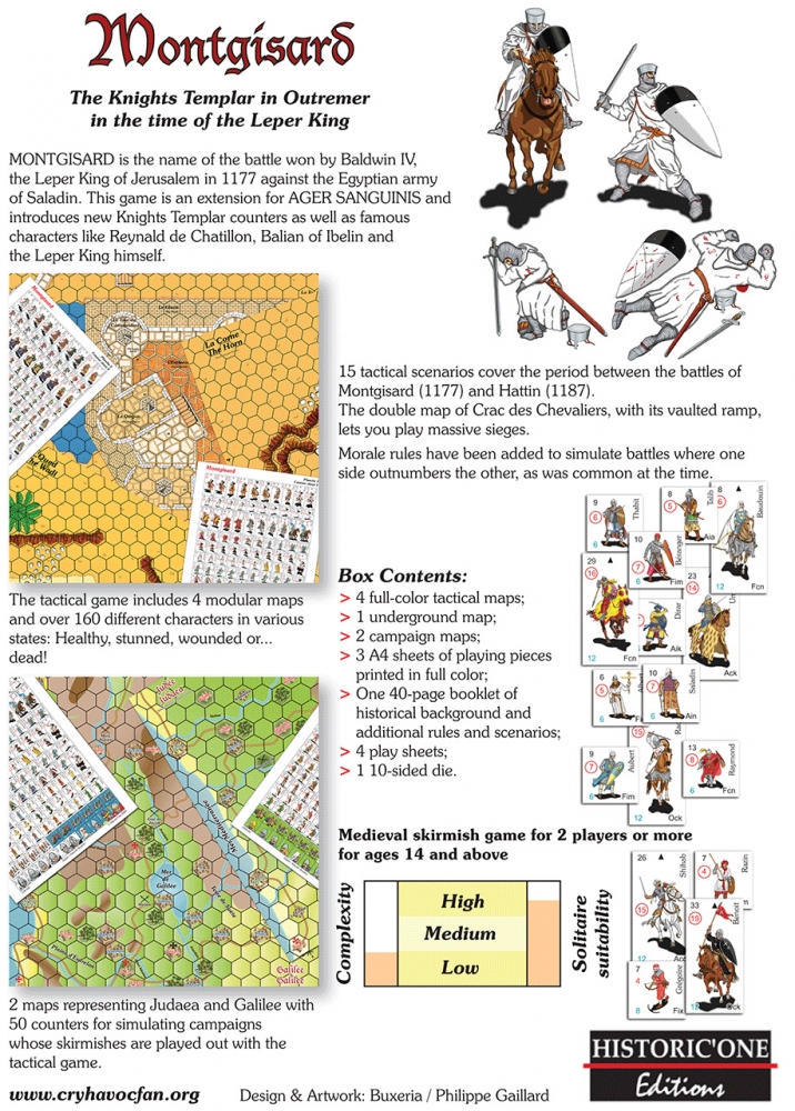 MONTGISARD is the name of the battle won by Baldwin IV, the Leper King of Jerusalem in 1177 against the Egyptian army of Saladin. This game is an extension for AGER SANGUINIS and will introduce new knight Templar counters as well as famous characters like Reynald de Chatillon, Balian of Ibelin and the Leper King himself.