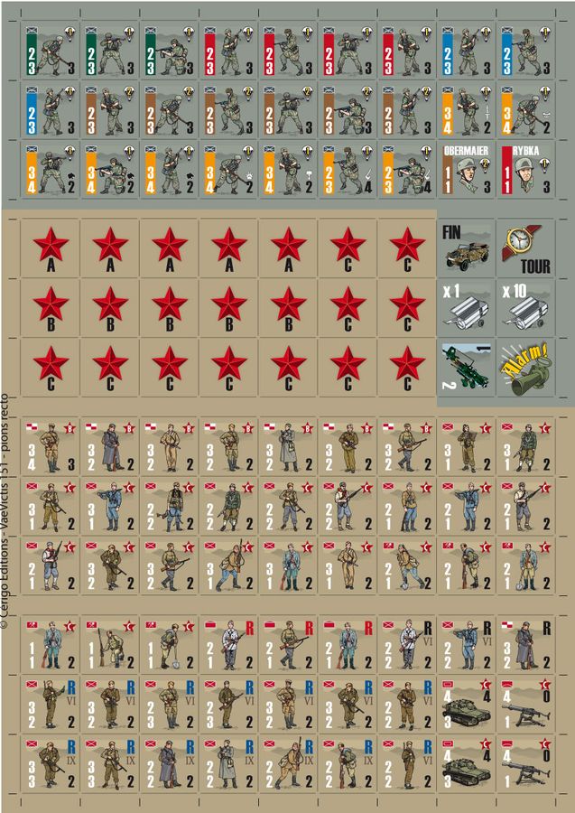 Le recto d’un pion représente un plein effectif, soit 35 à 40 parachutistes allemands, une compagnie de 20 à 100 partisans yougoslaves, un officier, deux mitrailleuses anti-aériennes, ou deux tanks italiens.