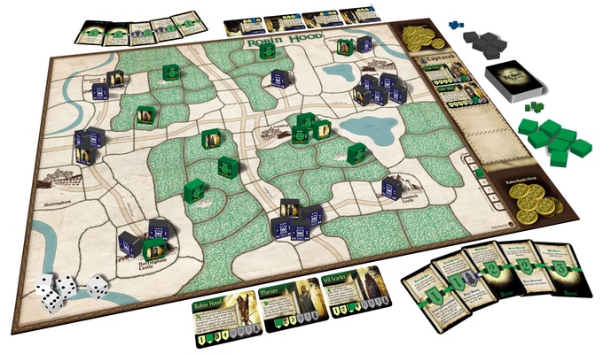 The characters are Robin Hood, The Sheriff of Nottingham, The Black Knight, Marian, Little John, etc. These are represented by both a card and individual game piece. The cards track health and execution timing. The game pieces are on the game board when in play. These are the only pieces that can target and duel each other during a battle. Robin Hood characters can be captured and executed by the Sheriff player.