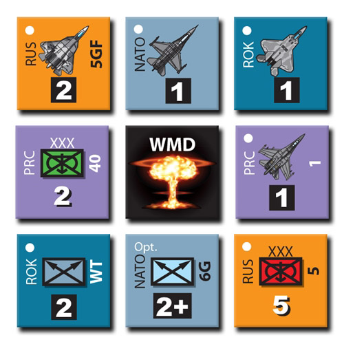 Putin Moves East is an operational-strategic level two player wargame covering a struggle for control between the Russian led Eurasian Union and a Coalition of opposing states, led by the People's Republic of China, to gain control of the Far East. Among other things, the game presumes a breakdown in Russian Chinese relations leading to open belligerency. Units represent operational task forces of corps or reinforced size; special forces; airpower; and cyberwar. Additionally, paramilitary forces play a significant role in the game rules. The objective of each player is to seize critical resource, industrial and communications centers, thereby gaining control of the Far East. Each hex on the map represents 100 kilometers from side to side. Each turn of play represents anything from three days of intense combat to a couple weeks of refitting. Ground units represent mostly corps sized task forces. Special forces units are regiments, brigades or groupings of cadres.