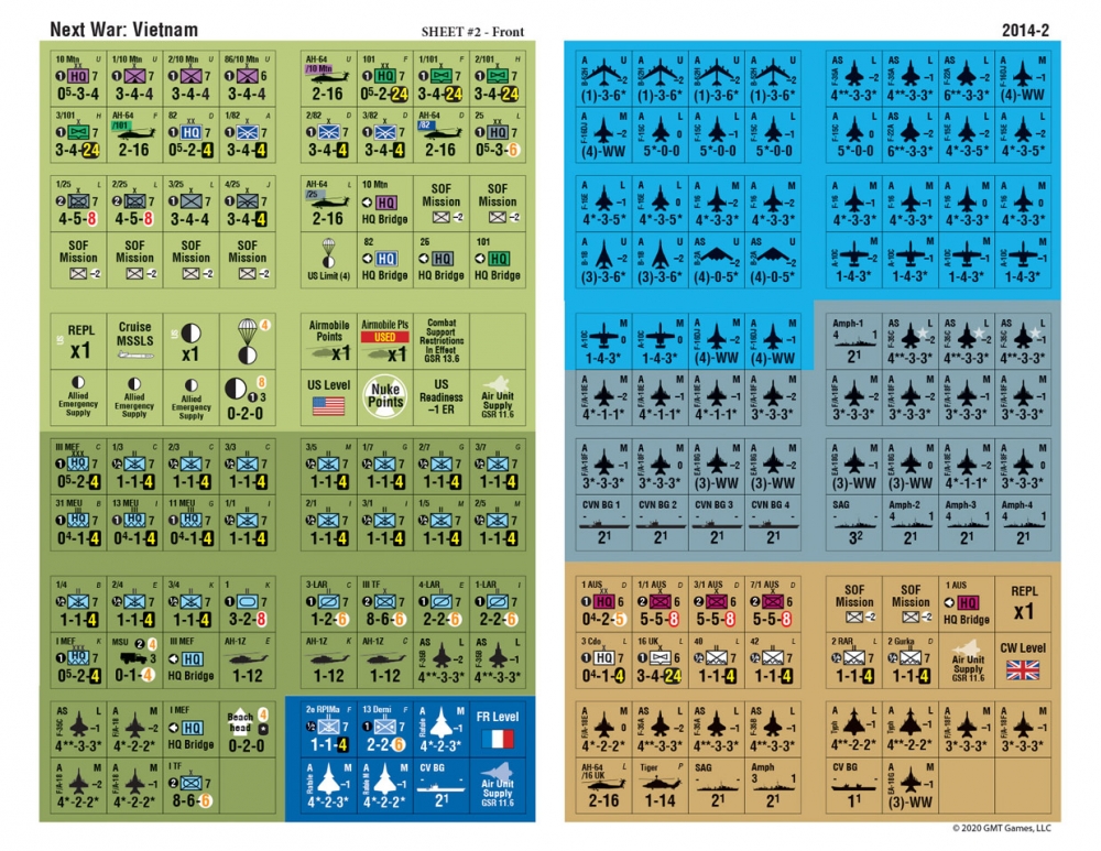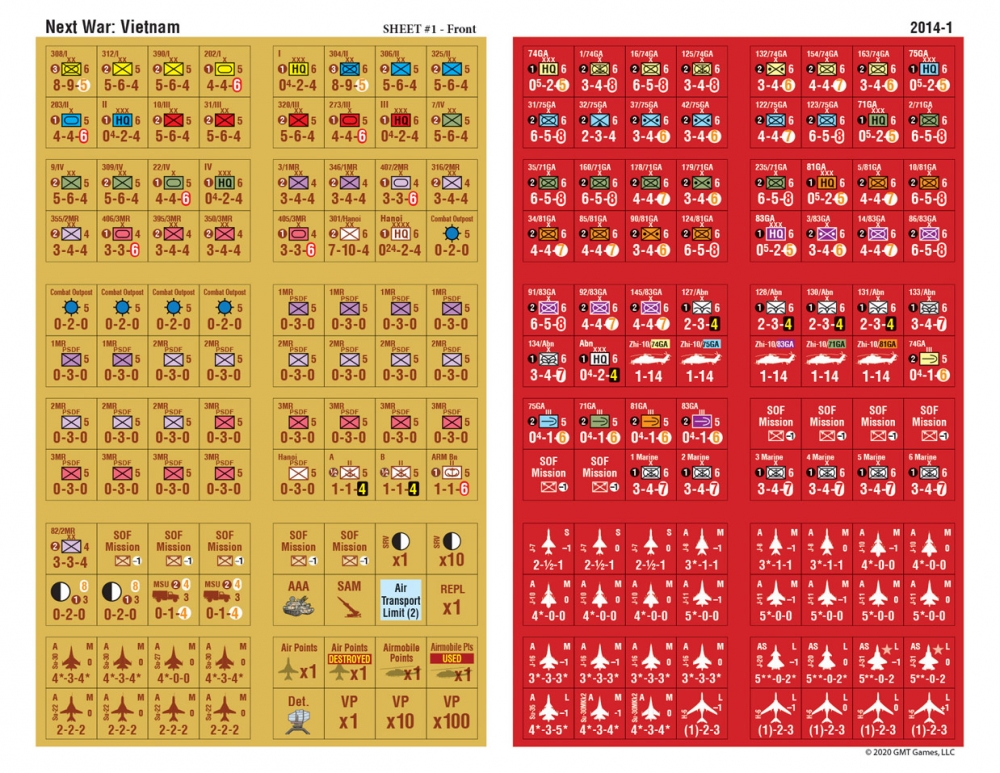 Next War: Vietnam primarily represents divisions and brigades of the armies of the People's Republic of China (PRC) and the Socialist Republic of Vietnam (SRV). All ground units are rated for their attack and defense strengths, movement capabilities, and unit efficiency. The Vietnamese People's Self Defense Force is represented both by units and special rules.