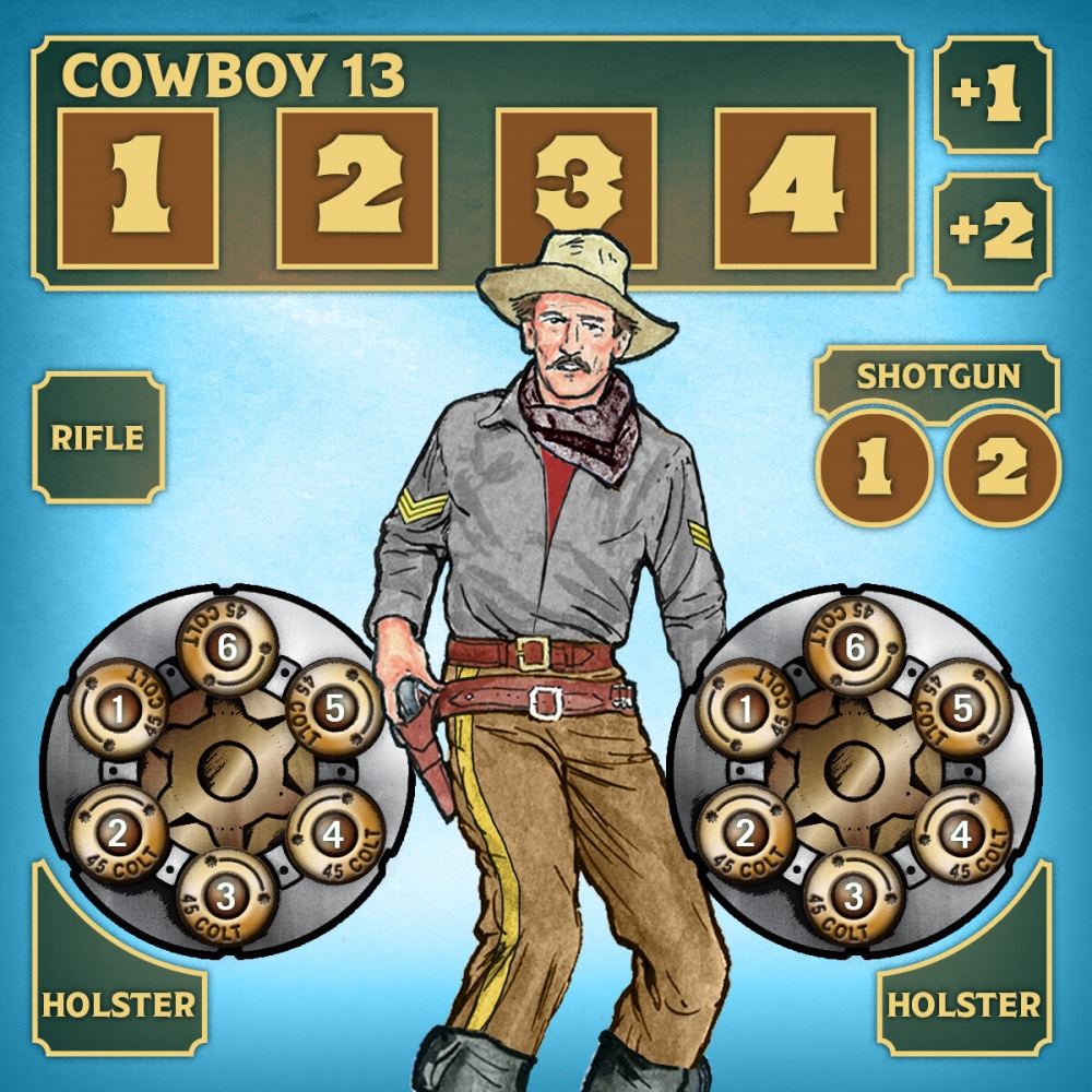 Some gunfighters are better than others and this is shown through modifiers for skill. Beware, being the top shot often means you are the first target. Who do you bring to the dance? Pistols, rifle, or shotgun? All are deadly. Each has limitations. And, what would a cowboy be without his trusty horse which allows him to get outta town twice as fast as boot leather and some cards and a bit of luck? A well played hand can leave you walking from the table with a smile, and your opponent in a bad fix. Gunfights in COWBOYS II use cards to show luck (good and bad), daring, bravery (or lack of it), and skills. So take your drink, steady your hand, and prepare to slap leather and draw…