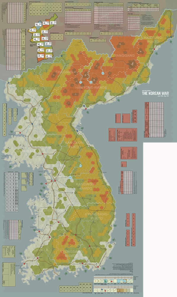 The players control ground and air forces of the United Nations, North Korea, and Communist China. Each player’s force consists of a wide variety of units, including infantry, marines, paratroopers, armor, and aircraft. The map is a 1:750,000 representation of the Korean peninsula from Pusan in the south to the Yalu River in the north. In addition to controlling military forces, the players must make a number of political decisions that have an important effect on the game. Above all, the UN player must strive to keep international tensions at a minimum for the purpose of preventing World War Three. Intense escalation and mobilization could have disastrous consequences for the militarily-unprepared United States. On the other hand, insufficient force applied to Korea could lead to the conquest of South Korea by North Korean communists.