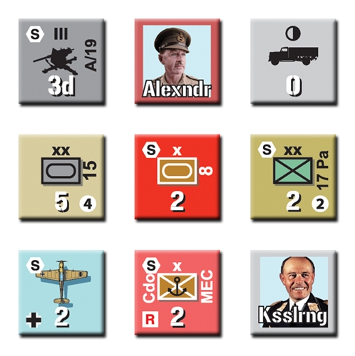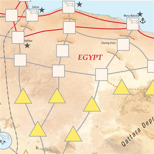 Drive on Suez: Rommel Drives Deep, 1942 is a solitaire game where the player takes command of the German-Italian Panzer Armee Afrika (PAA) during the 1942 campaign in Egypt as Rommel drives on the Suez Canal. The game system plays the Allied Middle East Command (MEC). The game begins immediately following the PAA capture of Tobruk in June 1942 and continues through to the time of the August battle of Alam el Halfa. Your goal is to seize strategic objectives such as major cities in the Nile Delta and the Suez Canal. You will have to deal with a wide variety of situations, from battling against fierce counterattacks to figuring out ways to extend your lines of supply. While Suez is a solitaire game, multiple players can play as the PAA team, making decisions by consensus, or each managing operations along one of the Routes of Advance. Each turn can represent any amount of time from two days of intense combat to two weeks of refitting and reorganizing. The map scale is approximately 45 km to the inch. Ground combat units represent everything from battalions to divisions. Air units represent two to six groups.