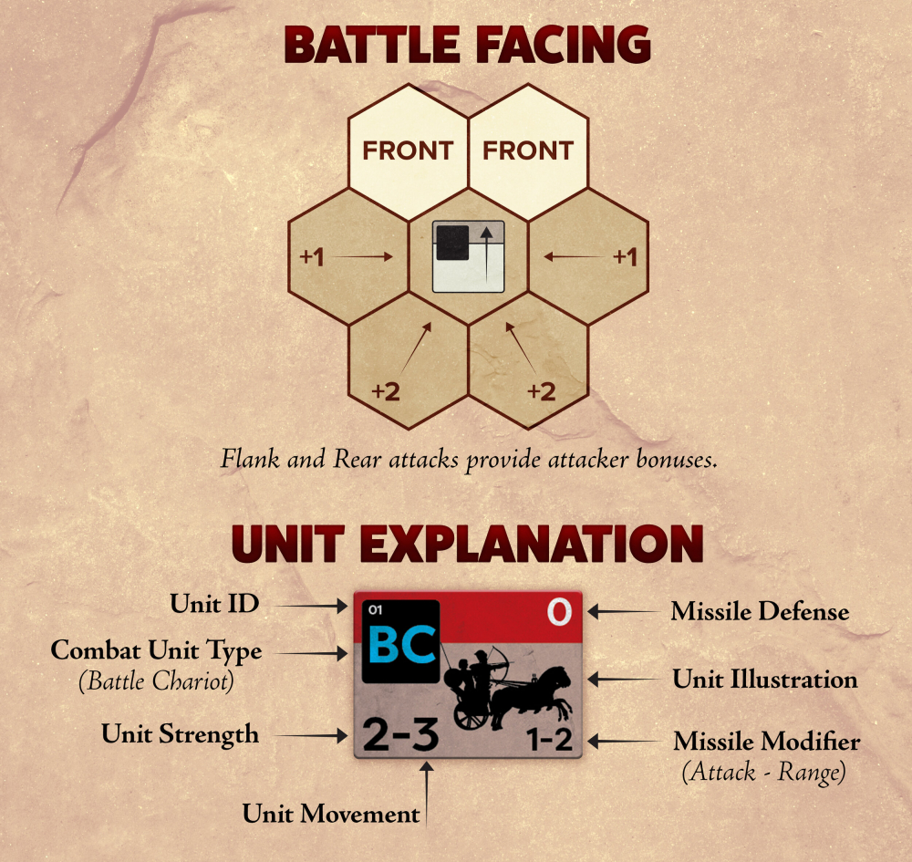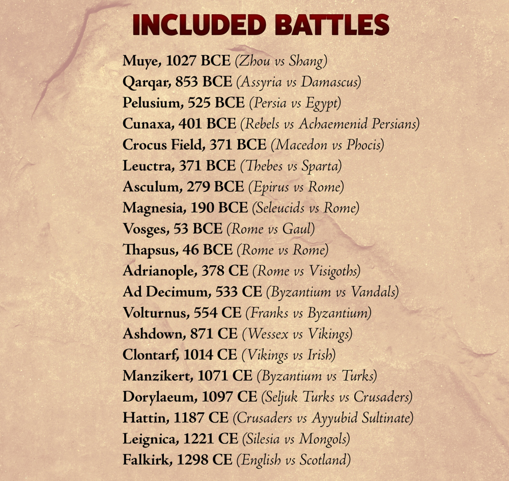 Each of the twenty included scenarios indicate the disposition of each army that engaged at that historical battle. Units include a variety of infantry types (including hoplites and the Macedonian phalanx), cavalry (including chariots and mounted archers), missile units (including slingers, longbows, and even early gunpowder weapons), and special units such as elephants and war wagons.