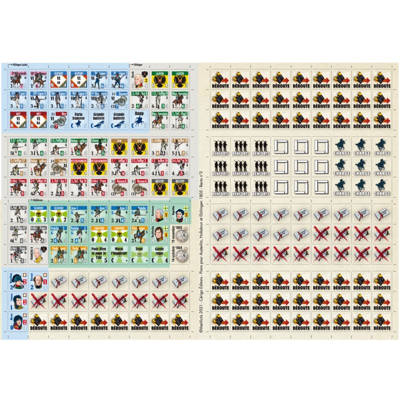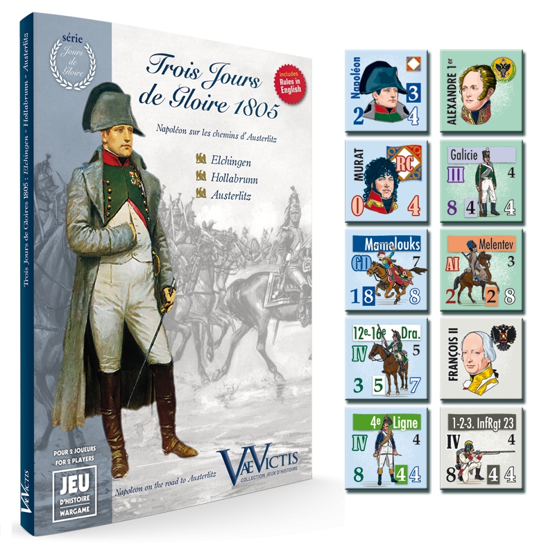 Trois Jours de Gloire 1805 propose aux joueurs des situations variées et de batailles d’ampleur différentes. A la tête de quelques divisions ou de plusieurs corps d’armées, les décisions à prendre changent de nature et les parties prennent une autre dimension. Saurez-vous montrer autant d’énergie offensive que Ney à Elchingen ? Parviendrez-vous à vous accrocher au terrain, comme Bagration à Hollabrunn ? Défi plus important encore, saurez-vous reproduire le chef d’œuvre de Napoléon à Austerlitz, en développant votre propre plan de bataille ?