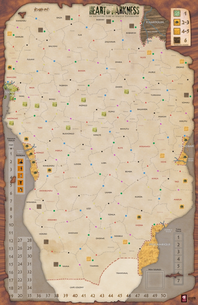 This is a game of adventure and exploration where you, together with up to four other players, venture into deepest Africa. The time period is mid-19th century and you start your expedition at one of the six Ports of Entry.
