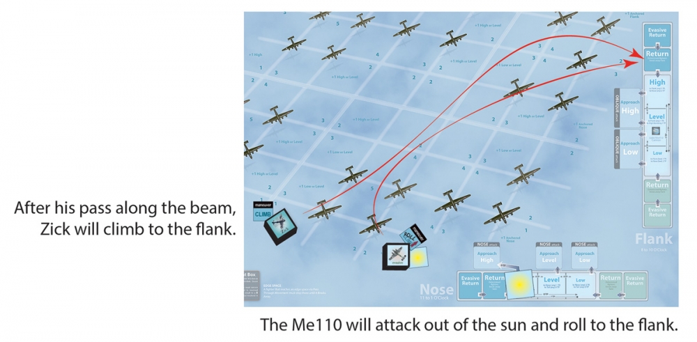 Will you strike the formation from the nose or from the tail? Will your fighters make a dead-level attack or will they drop bombs on the formation from above? Will you split your squadron to attack from multiple angles, or will they charge at the bombers in successive waves? Will you even have time for this kind of maneuver?