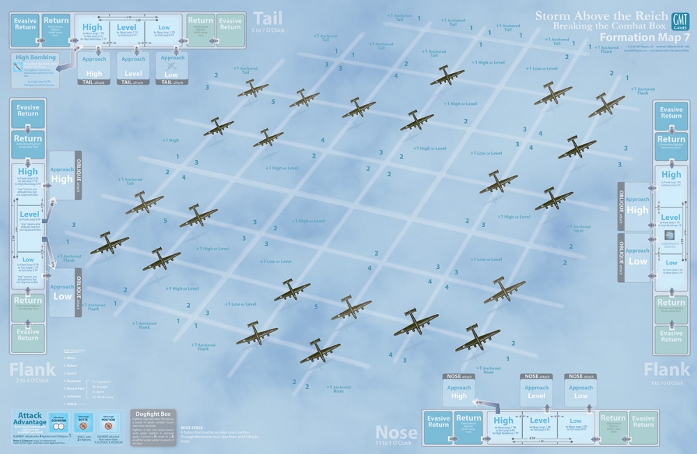 The mission is played on a formation map that depicts as many as twenty-one B-24 bombers in a tight array. The game comes with two double-sided map boards (four maps in all) that as a set chronicle the development and increasing lethality of the bomber formation. Each map is a bigger and more lethal terrain than its predecessor.