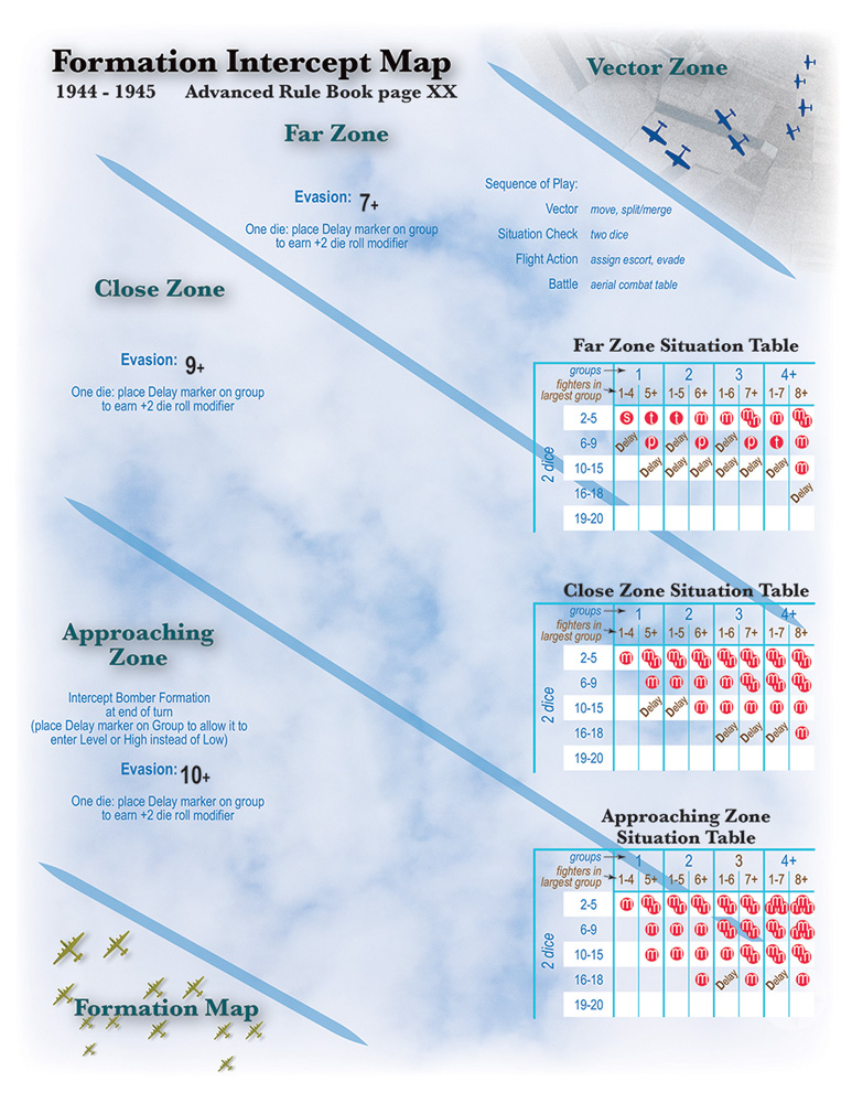 Basic and Advanced Games: In the basic game, your goal is to knock bombers out of formation, or destroy them outright. The advanced game adds “pursuit” where you dispatch fighters to chase after and intercept bombers knocked out of the formation. Played out on an 8.5” x 11” map depicting a single bomber, pursuit makes the advanced game even more challenging.