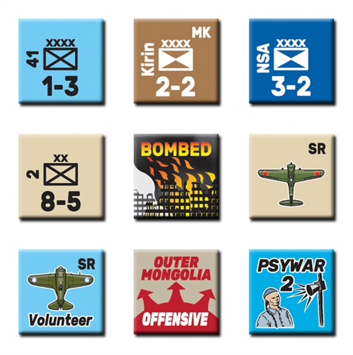 Rising Sun Over China: Japan vs China 1931 – 1937 is an operational-strategic level two player wargame covering the campaigns in northern China, 1931 to 1937. These campaigns revolved around the regions of Manchukuo (Manchuria) and Menjiang (Inner Mongolia), and culminated in the Japanese invasion of China proper, taking the capital at Peiping (Peking). There was also the possibility of Soviet intervention. The game has two players: the Japanese Empire and the Republic of China. The Japanese objective is to gain control of northern China to provide a strategic advantage for the ensuing Sino-Japanese War which commenced in July 1937. The Chinese objective is to retain control of strategic regions of northern China, thereby forestalling a larger Japanese invasion. Each hex on the map represents 75 kilometers across. Each turn of play represents one year of operations. Japanese ground units are divisions and brigades. Allied Japanese, as well as most Chinese units, are at the army and corps level, representing shifting arrays of forces. Air units represent various numbers of sorties needed to accomplish missions.