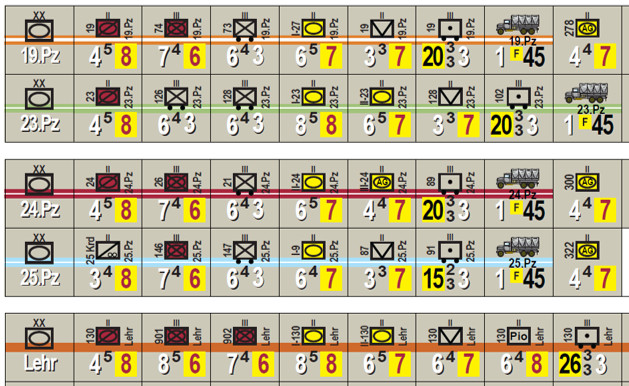 - Les QG d'armée, de groupe d'armée et de Kessel de l'Axe, ainsi que les marqueurs de Kampfgruppe qui dépeignent la flexibilité opérationnelle de l'Axe.