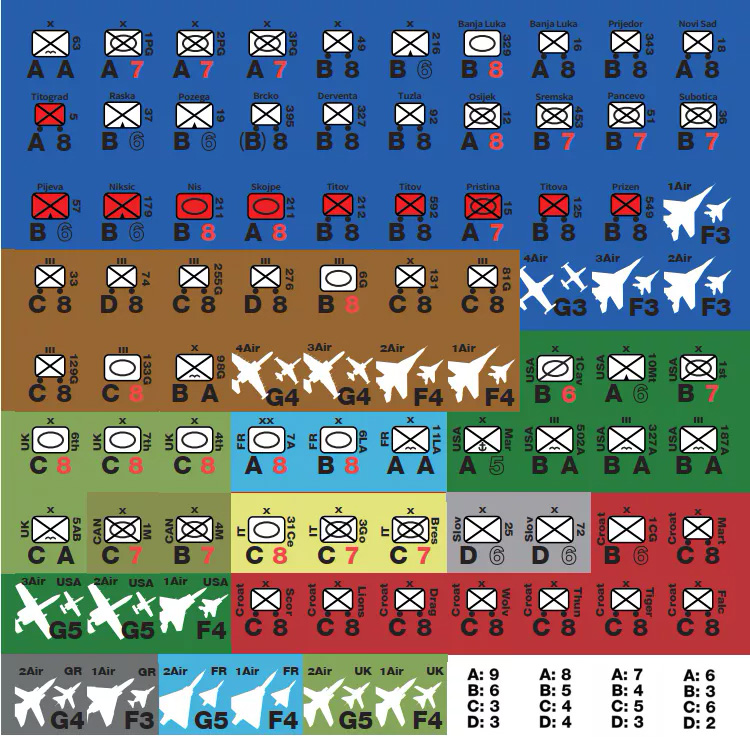 L'OOB comprend une collection bien étudiée de divisions et de moyens aériens disponibles. L'OOB russe est basé sur la milice qui a attaqué Grozny en 1994. La JNA est représentée avec précision, bien qu'elle soit supposée être à pleine puissance. De nombreux autres pays des Balkans et de l'OTAN sont représentés. 1995 se concentre plus sur la manoeuvre et moins sur le chrome car il n'y a pas de pions spéciaux, mais beaucoup d'unités à la place...
