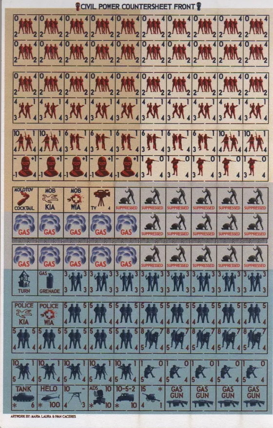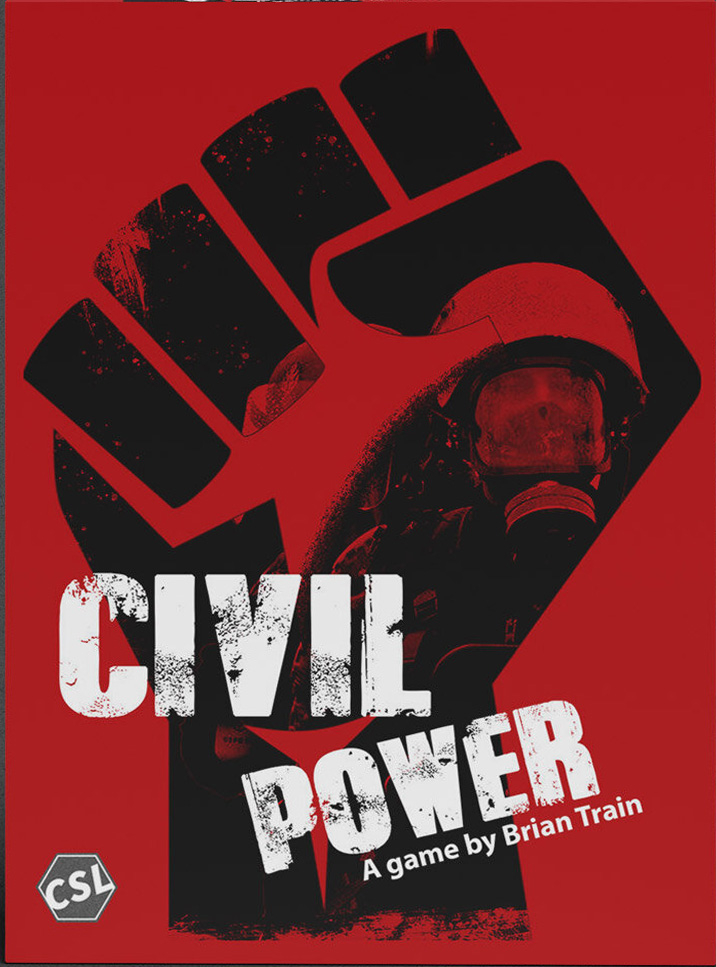 Civil Power est un jeu de Brian Train qui modélise les désordres civils de masse, les émeutes, les raids et autres phénomènes urbains violents. Un joueur prend le commandement de la police/des autorités locales tandis que l'autre joueur prend le commandement de la foule. Le jeu est asymétrique dans ses moyens, ses motivations et ses opportunités : le joueur de la police dispose de la discipline, de la puissance de feu et de la technologie ésotérique tandis que le joueur de la mafia dispose de l'indignation, du nombre et des cocktails Molotov. La police doit parvenir à contenir et à maîtriser la foule par une violence soigneusement répartie : la bonne quantité supprimera ou démoralisera les forces de la foule, tandis que la trop grande quantité causera des pertes qui coûteront des points de victoire à la police. Le joueur de la foule a moins de contraintes, mais il sait aussi qu'une émeute est temporaire.