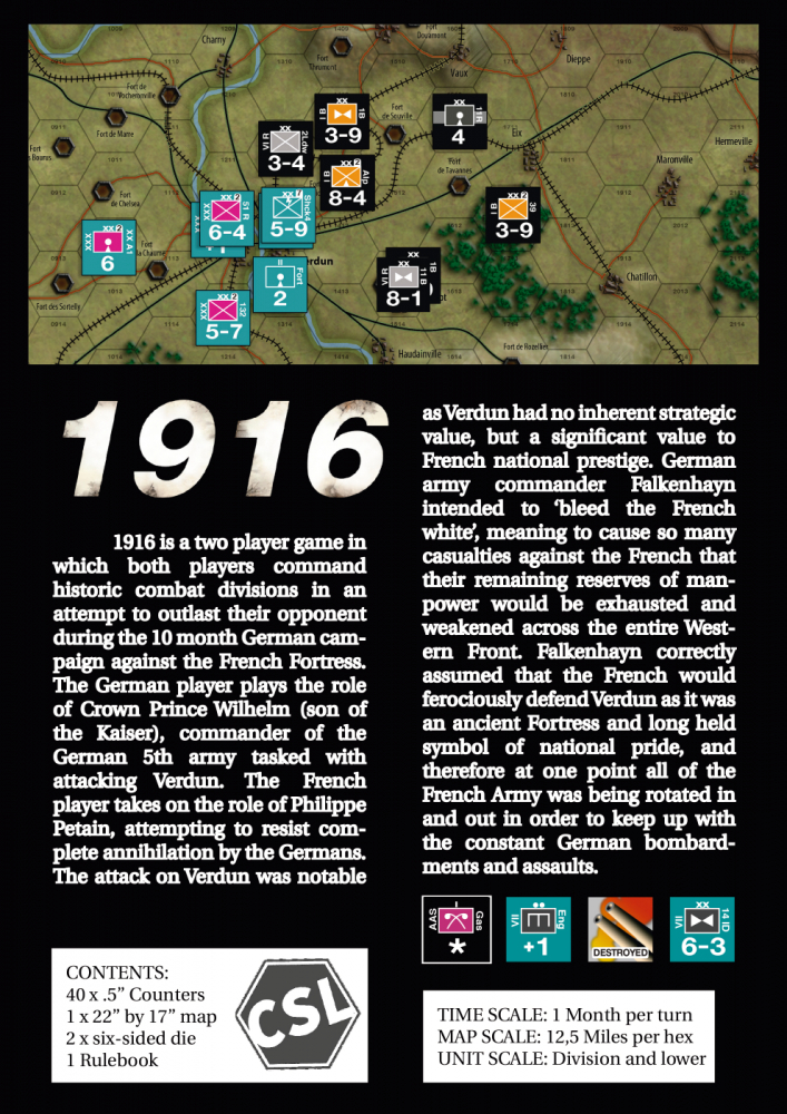1916 : Verdun est un jeu brutal d'attrition, de manœuvre et d'administration. Les joueurs commandent chacun de nombreuses divisions et doivent brûler judicieusement les ressources afin de survivre à leur adversaire. Les joueurs doivent planifier les opérations à l'avance afin de maximiser ce dont ils disposent, mais la plupart des plans se désintègrent généralement face à l'ennemi. Malgré sa taille et la brièveté des règles, il s'agit d'un jeu assez complexe et granuleux, avec de nombreuses décisions atroces à prendre par les deux joueurs.