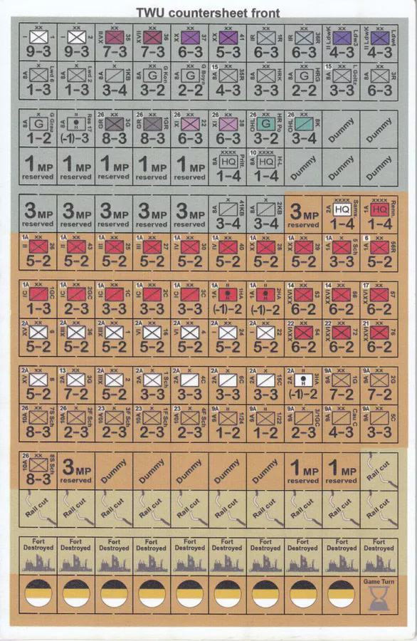THE WORLD UNDONE (TWU) est un nouveau système opérationnel, au niveau des divisions, pour la première guerre mondiale, inspiré de The Marne de feu John Young. Le résultat est une simulation immersive extrêmement simple, nuancée et rapide à jouer des premières grandes victoires allemandes de la Première Guerre mondiale. Le jeu se décompose en une simple phase de mouvement-combat-mouvement-combat pour chaque camp, les unités participant à la première phase de combat ne pouvant ni se déplacer ni combattre pendant la seconde. Le jeu se déroule du 13 août au 13 septembre et couvre les batailles de Tannenberg et des lacs de Mazurie. Des TRC distincts sont utilisés pour les forces allemandes et russes afin de refléter les différences de qualité et de doctrine. Il s'agit d'un jeu extrêmement peu complexe qui, je l'espère, sera en mesure d'attirer de nouveaux joueurs dans le wargame et de rappeler aux anciens joueurs pourquoi ils ont commencé à jouer en premier lieu. The World Undone sera une série de 3 parties couvrant la Prusse orientale, la Galicie et le front occidental (peut-être aussi la Serbie/Autriche).