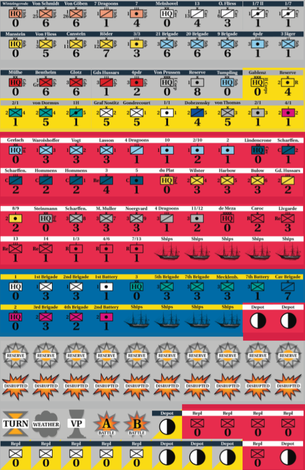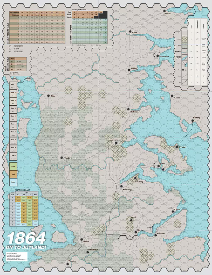 1864 : On To Jutland couvre l'un des conflits les moins connus du 19ème siècle, une lutte brutale pour le Schleswig et la péninsule du Jutland alors que le Danemark tente de conserver ses possessions en Allemagne. Le jeu est une simulation rapide et sans fioritures qui utilise une table de résultats de combat basée sur les probabilités et une table de tir d'artillerie avec un jet de d10 pour traiter le combat. Le quartier général peut permettre aux unités de s'empiler à des limites plus importantes et fournir un peu de brouillard de guerre. Enfin, une option what-if permet une intervention suédoise du côté danois, car ils avaient préparé environ 30 000 volontaires pour le faire, mais cela n'a jamais abouti.